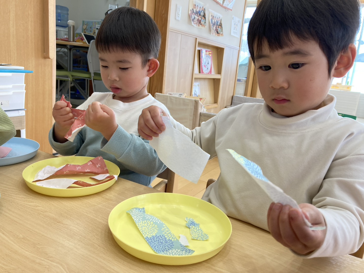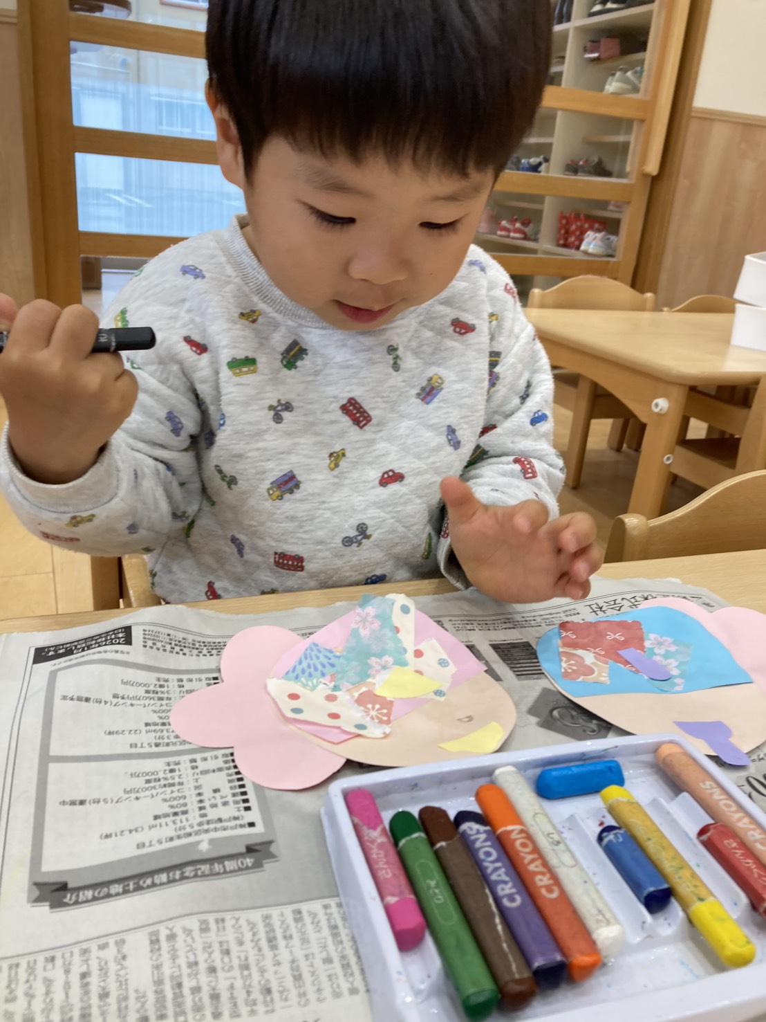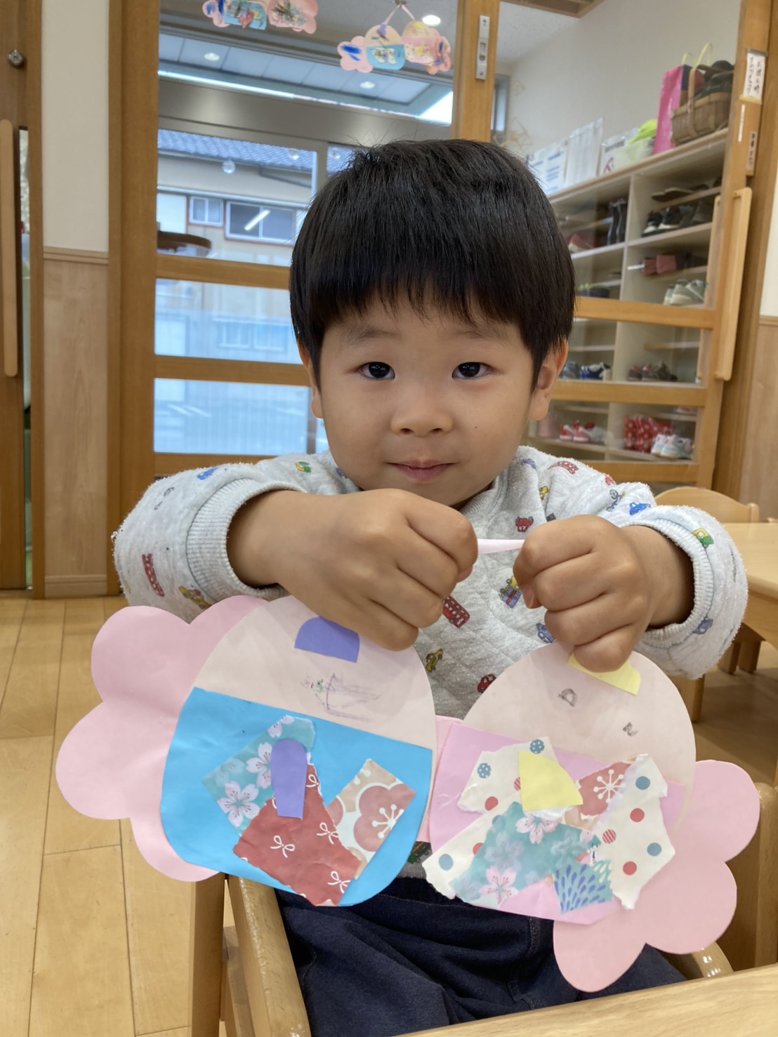 一方、ひまわり組さんはのりや折り紙をつかってひな飾り作りに挑戦しました!